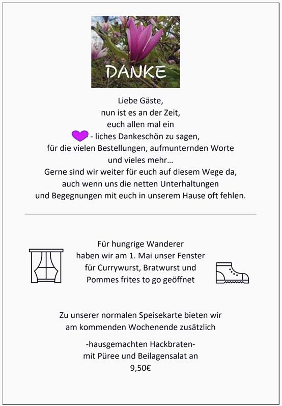 auch für die kommenden Wochenenden bieten wir Euch weiterhin unseren Essen-Abholservice an.